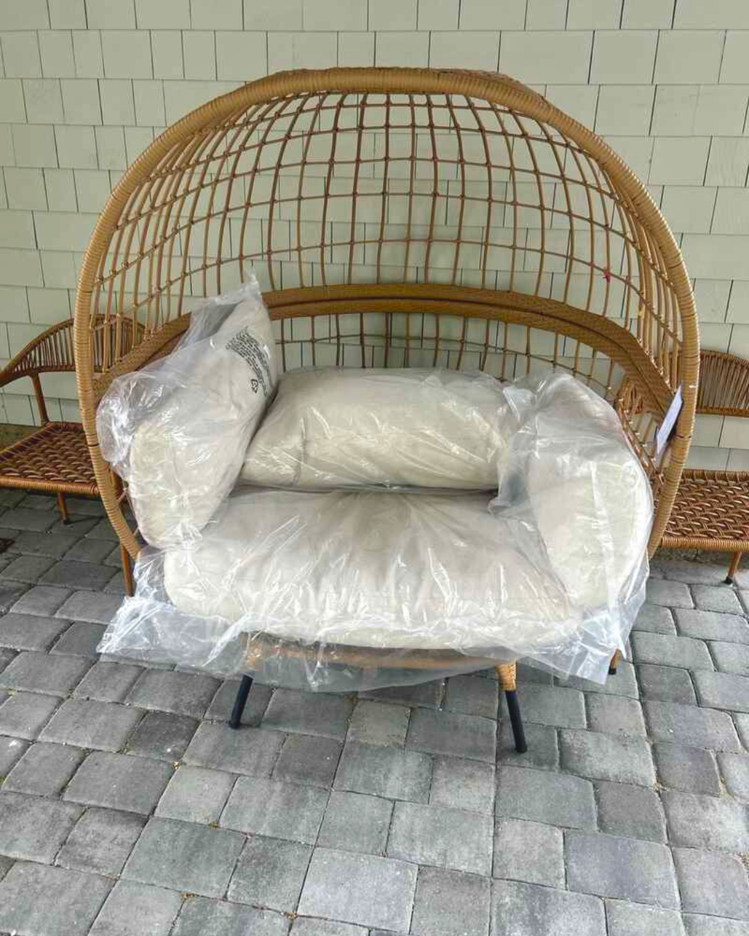 Image 1: Wicker egg chair delivered and ready for setup. | Image 2: Outdoor lounge chairs placed poolside for a relaxed retreat. | Image 3: Sectional patio seating arranged on a rooftop deck.