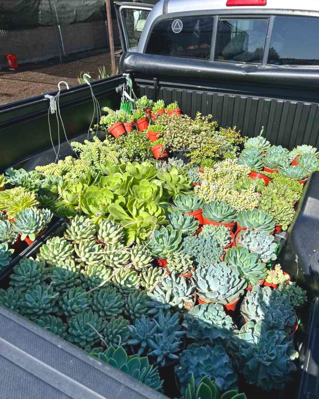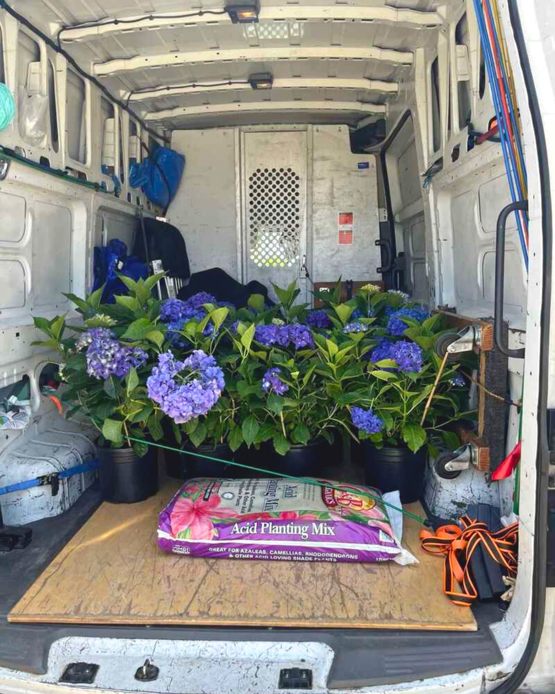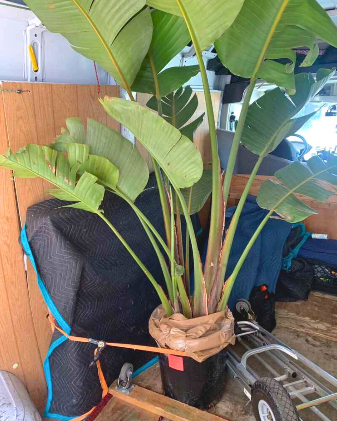 Image 1: Assorted succulents loaded into a truck bed for delivery. | Image 2: Bird of paradise plant secured inside a moving van. | Image 3: Hydrangeas and garden supplies prepped for same-day drop-off.