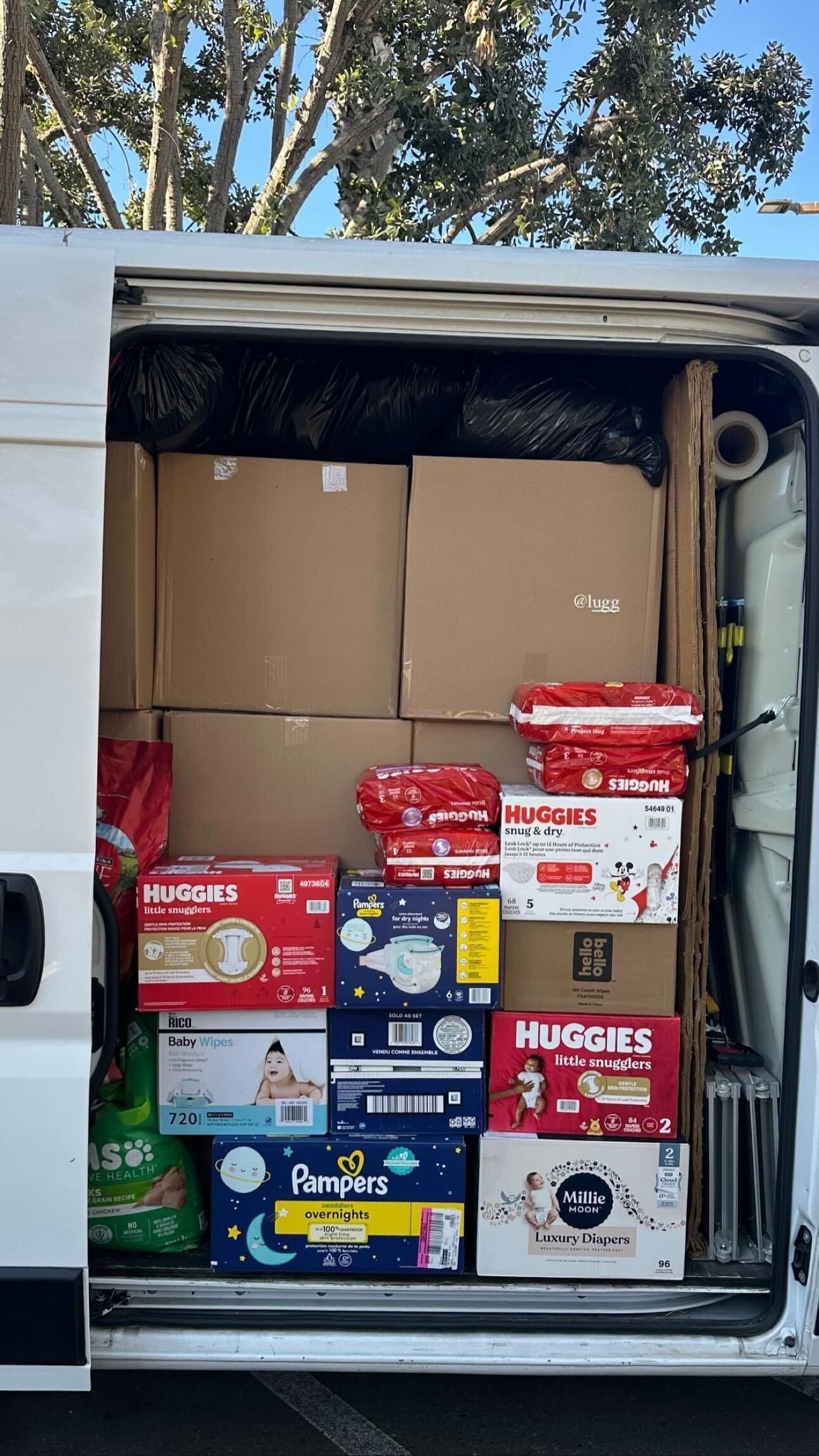 Image 1: Vans packed with baby supplies, water, and essentials. Image 2: Lugg crews and volunteers pick up supplies. Image 3: Donation drop-offs prepped and organized for wildfire relief.